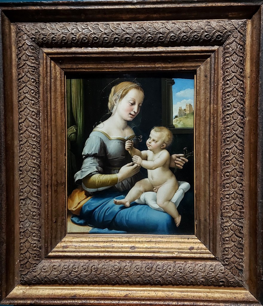 On the right is detail from the full piece, highlighting the tenderness of touch, soft folds of fabric and skin, the passing of the pink carnation flowers between carefully rendered fingers. It is an intimate moment as both figures gaze at one another, the viewer observes. The domestic setting reflects Raphael’s intent to portray first and foremost the love between a mother and her child, reified by the central placement of their hands within the composition: Raphael’s primary occupation was their connection.
